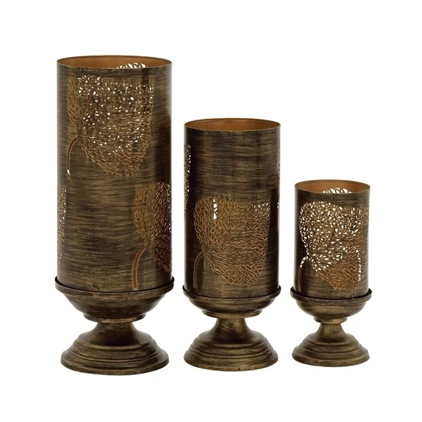 - Texture and earthy artistry set of 3 metallic gold metal candle holders with pierced leaf designs with pedestal bases that add a charming silhouette while elegantly elevating them. A textural black brushstroke finish adds even more dimension.