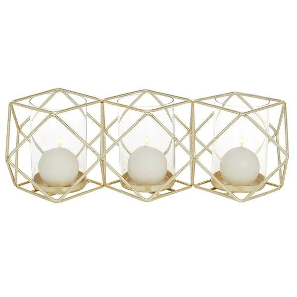 - 3 cylindrical hurricane glasses that are ideal for votive or pillar candles, frames attached to each other with open geometric triangle design