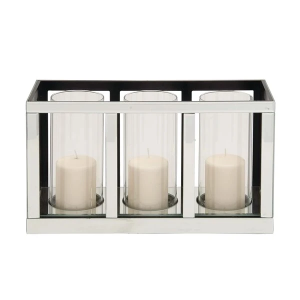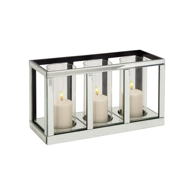 - This candle holder holds three candles with protective glass and outer frame with a mirror accent