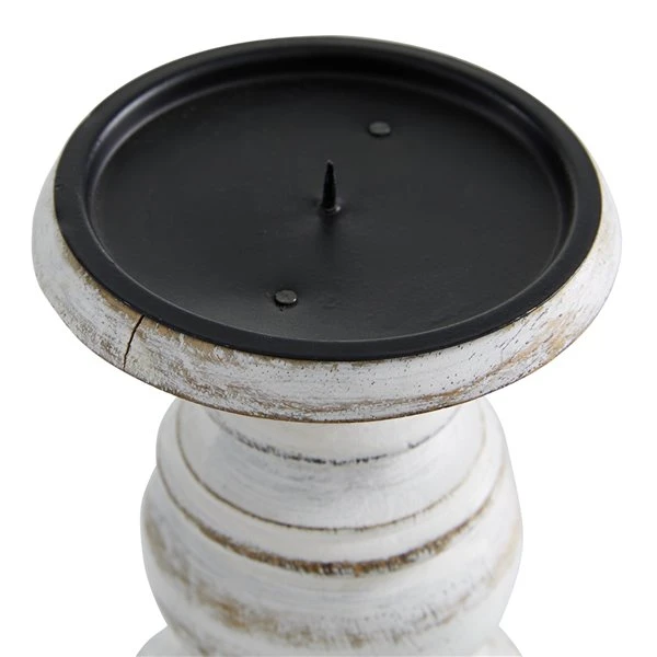 - Each round base has a silhouette inspired by antique bases and legs with distressed white finish and spike to stick your wax candle to secure in place