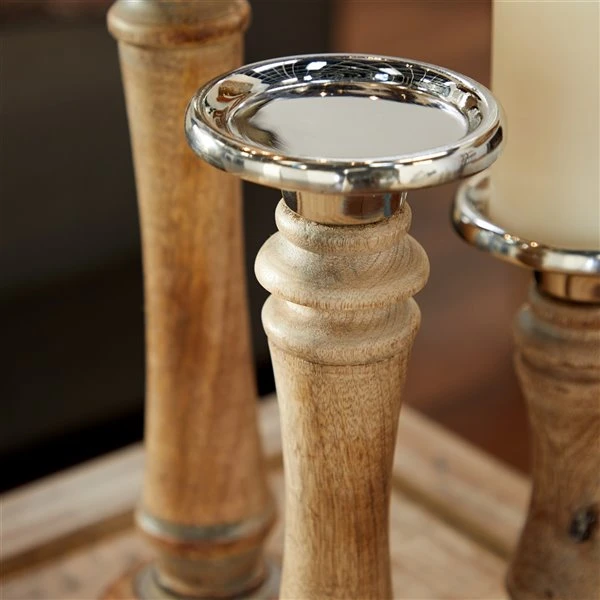 - This pillar candle holder set is crafted from durable mango wood and metal