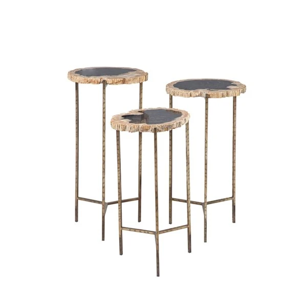 - Decorative round tables made of petrified wood stone and stainless steel