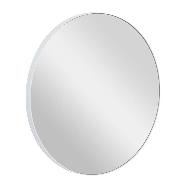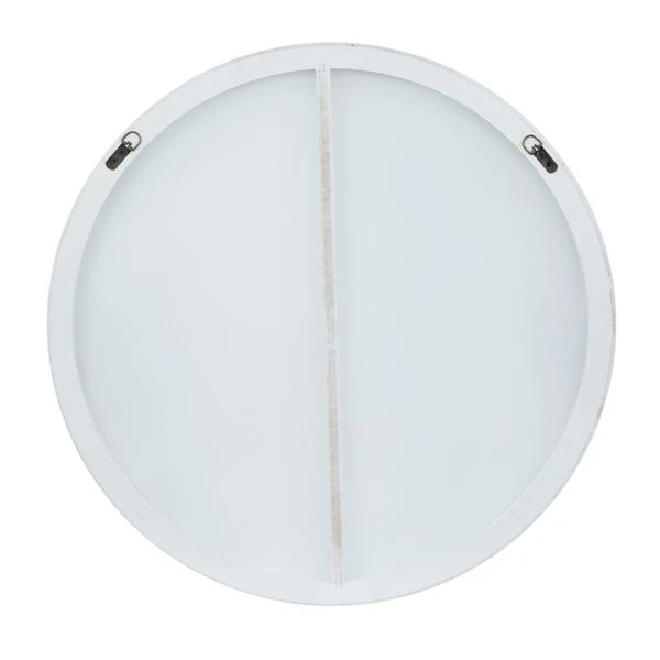 - Features a round-shaped reflective glass and a thin white wooden frame