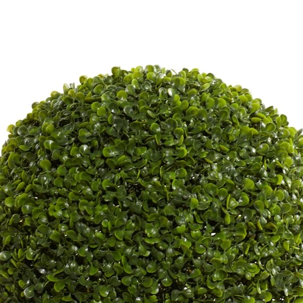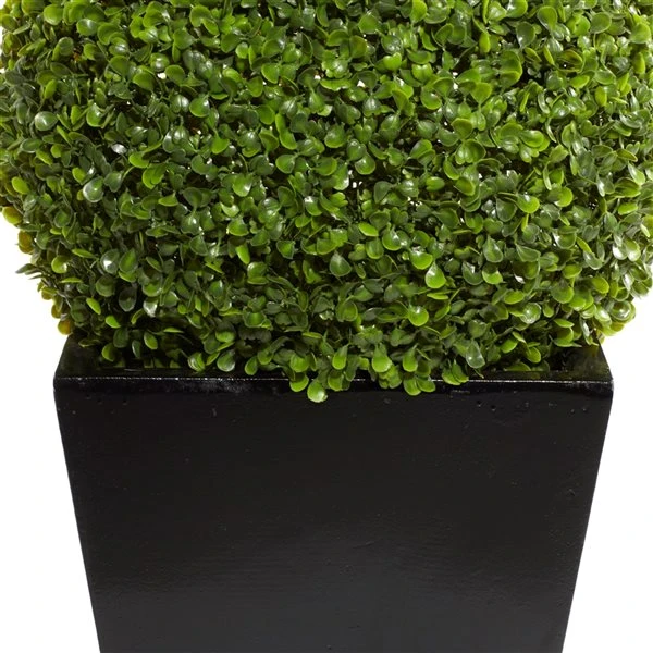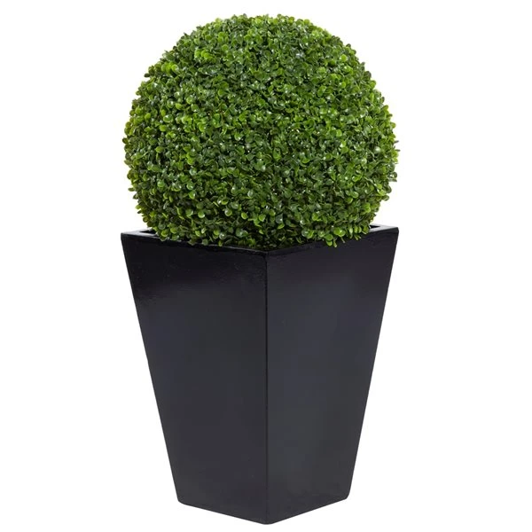 - This plastic topiary has a smooth green finish and a glossy black planter