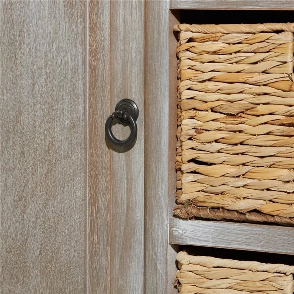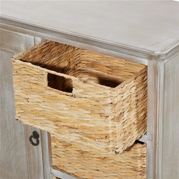 - Features a whitewashed wooden frame with brown rattan woven baskets