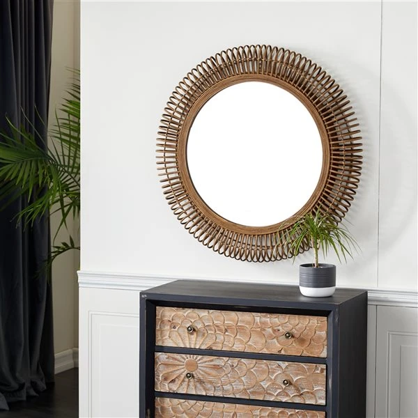 - This spectacular brown rattan wall mirror can be a timeless accent piece for natural, industrial, and traditional-themed living spaces