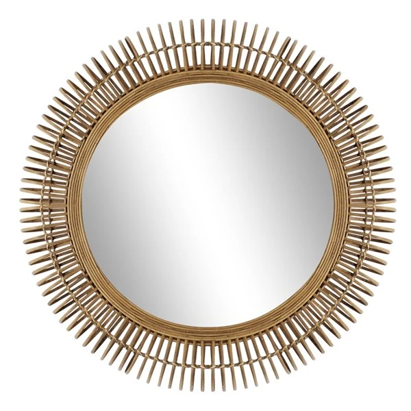 - Beachy natural rattan bands around the round mirror inlay and looped rattan forming a radial striped pattern on the outside of the frame