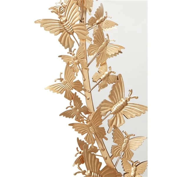 - 3D gold butterflies in multiple sizes are welded by metal rods to this decorative mirror, layered over each other and flying in various directions