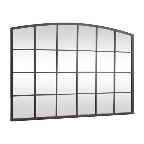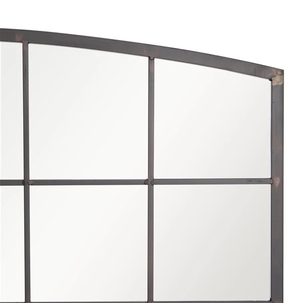 - Features arched metal frame, clear reflective glass, and grid-patterned design