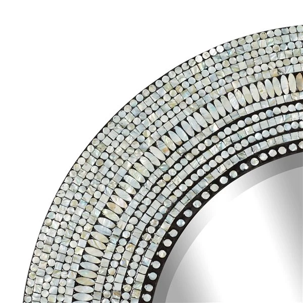 - Iridescent shell tiles surround the reflective centre