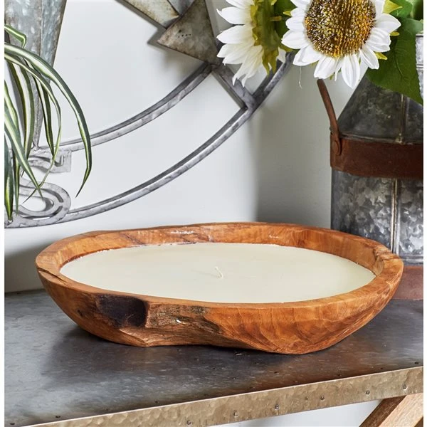 - Features a wooden candle holder with white wax candle inside