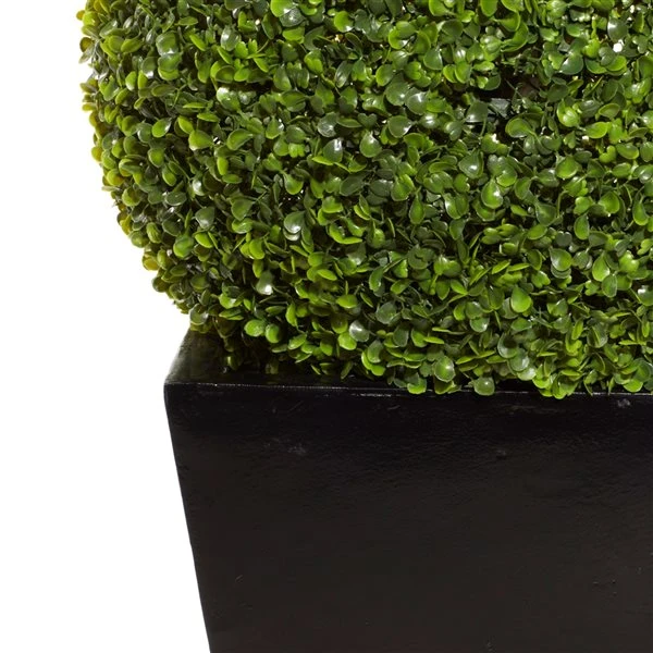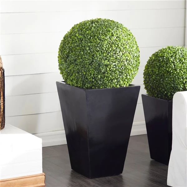 - This plastic topiary has a smooth green finish and a glossy black planter