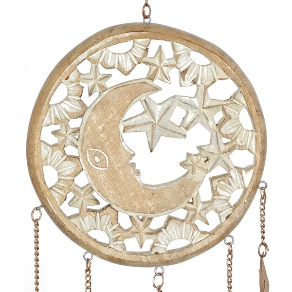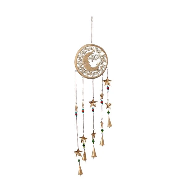 - Features a round cream white-finished crescent moon and stars wind chime, and five triangular iron bells hanging at the bottom