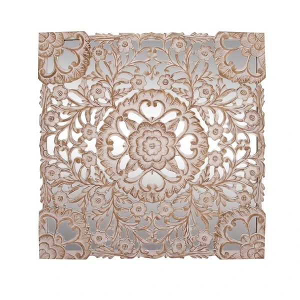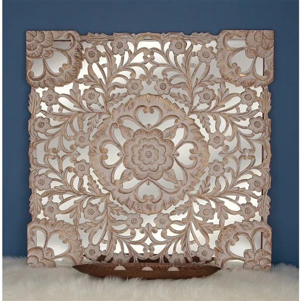 - Designed with an overlay of intricate floral carvings in white patina finish