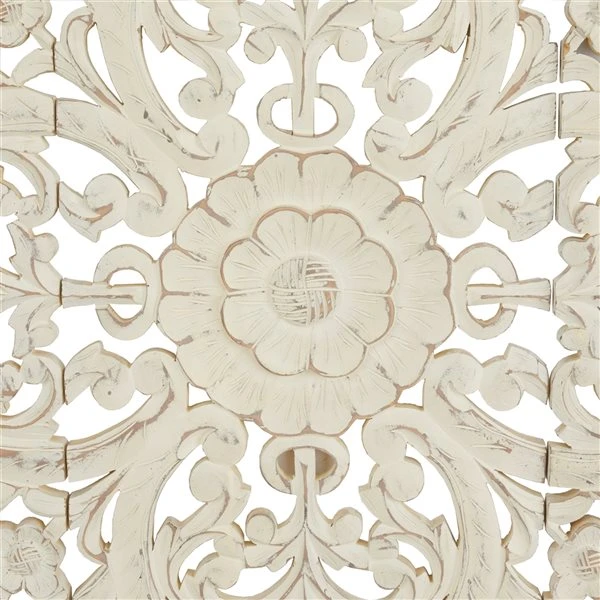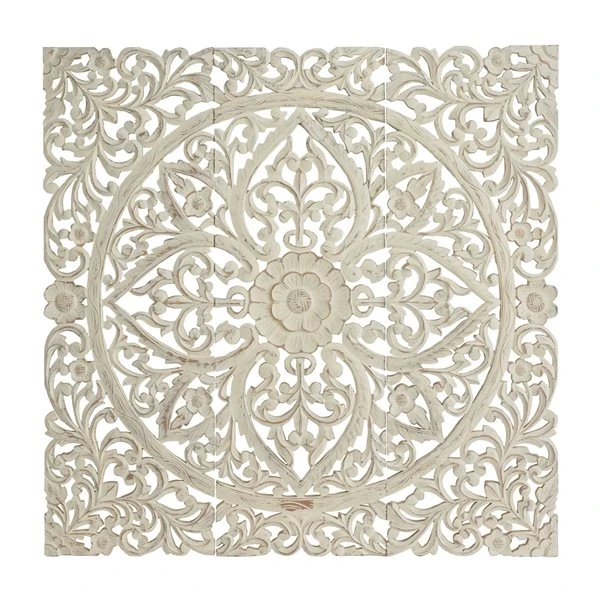 - This 3 panel medallion wall decor highlights a faintly distressed beige finish that enhances textured look