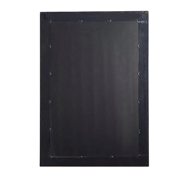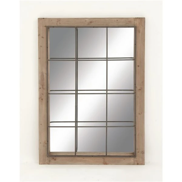 - Natural wood finish around the frame with slate grey iron cage over the mirror