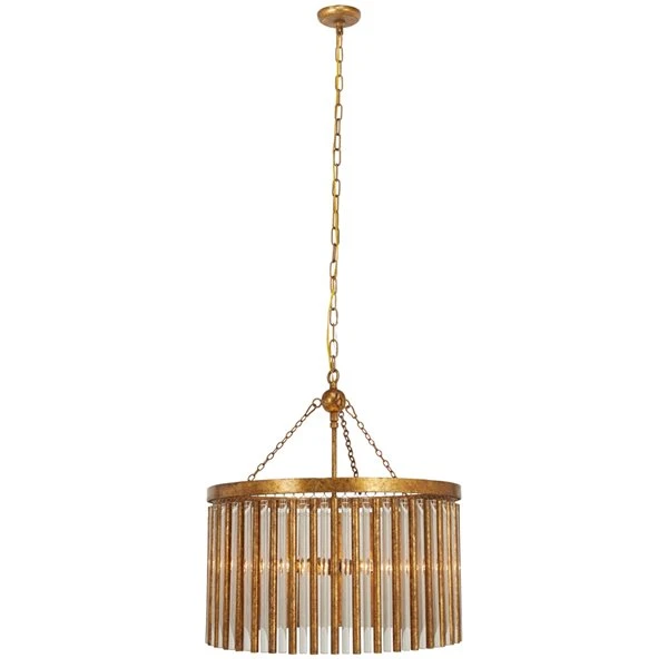 - It features gold body and hanging chain with clear glass and brushed metallic gold dangling