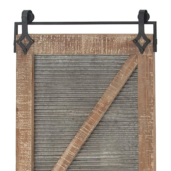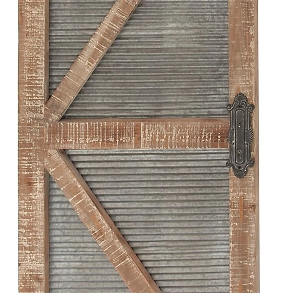 - features a black iron bar, a distressed brown and white wooden frame, and a galvanized grey metal door