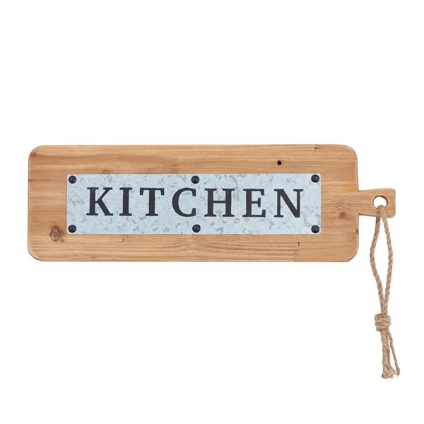 - Wooden kitchen wall sign with chopping board-inspired design with a metal plaque and a jute rope handle