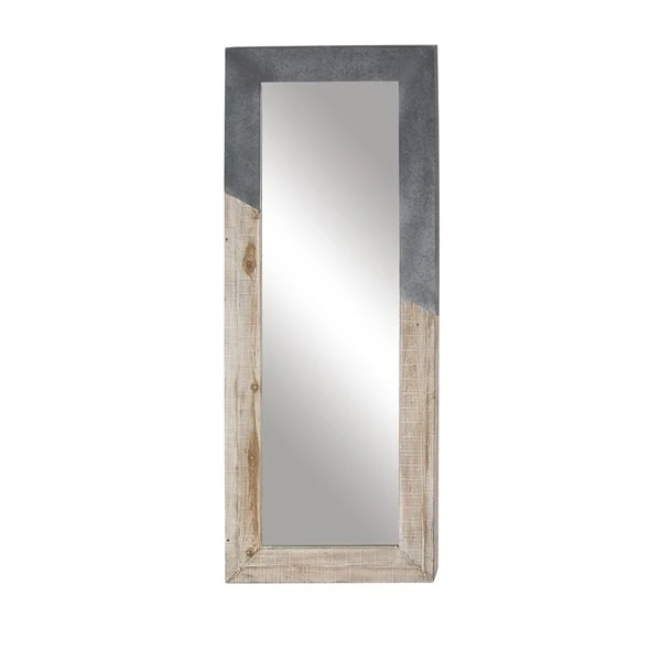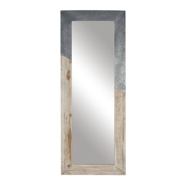 - Features a rectangular galvanized metal and natural wood wall mirror