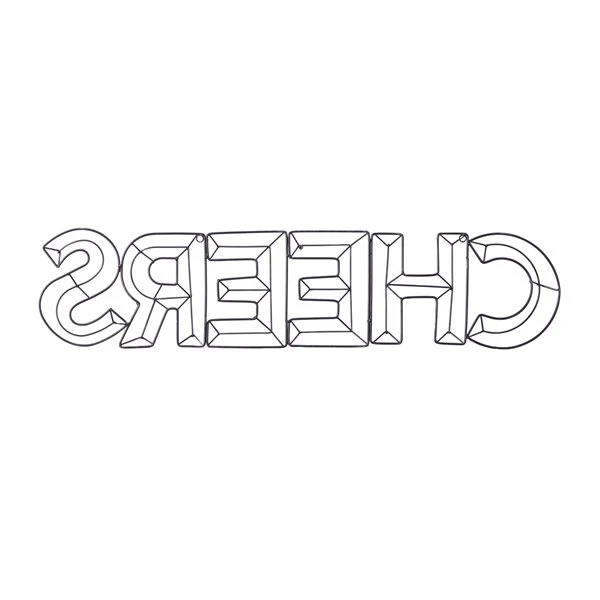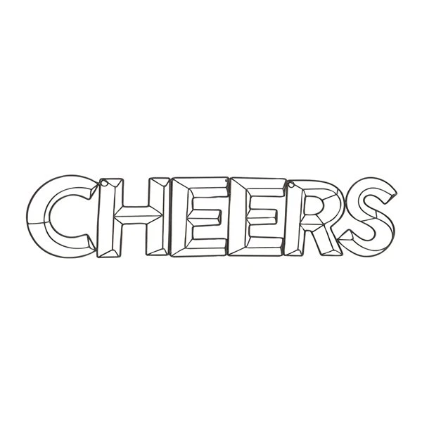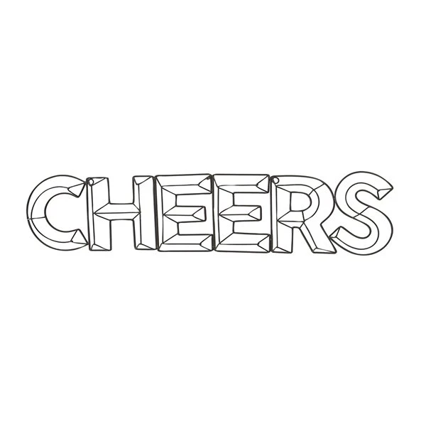 - Features a stencil-styled outlining of the word “CHEERS”
