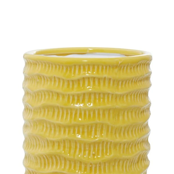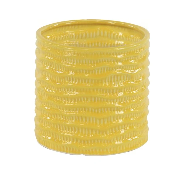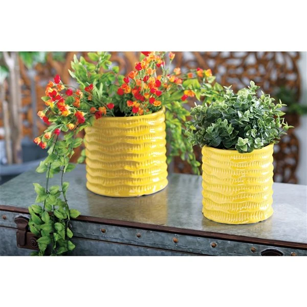 - Features cylindrical ceramic planters in varying sizes designed with wide mouths and horizontal ribbing
