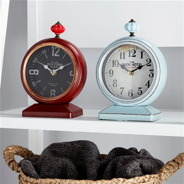 - Circular frames house white and black clock faces with bold, easy-to-read numerals and antique script; decorative pumpkin-shaped finials top each clock; one poppy red and one light aqua blue clock
