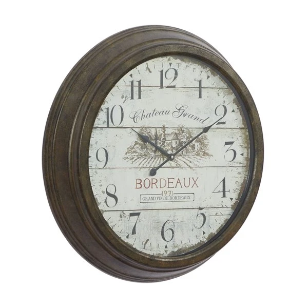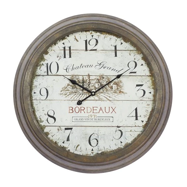 - With black clock hands and easy-to-read numerals, designed with a distressed white iron clock face with French-inspired illustrations
