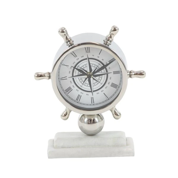 - Wheel-shaped clock’s face is reminiscent of a traditional compass with a solid silver stainless steel construction