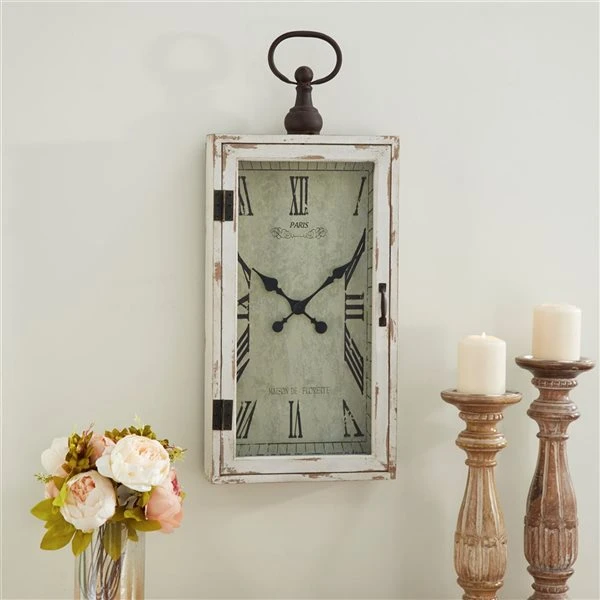 - Distressed decorative chipping over white wood finish, textured clock face, and brown loop finial at the top