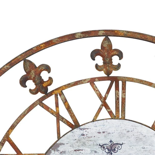 - This fleur-de-lis wall clock highlights rustic brown outline finish and distressed daisy white clock face finish