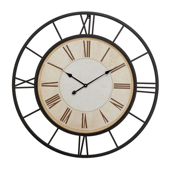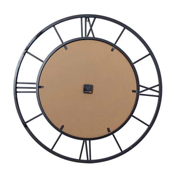 - Decorative wall clock with numerals along the openwork black frame, clock face highlights Roman numerals and spade clock hands