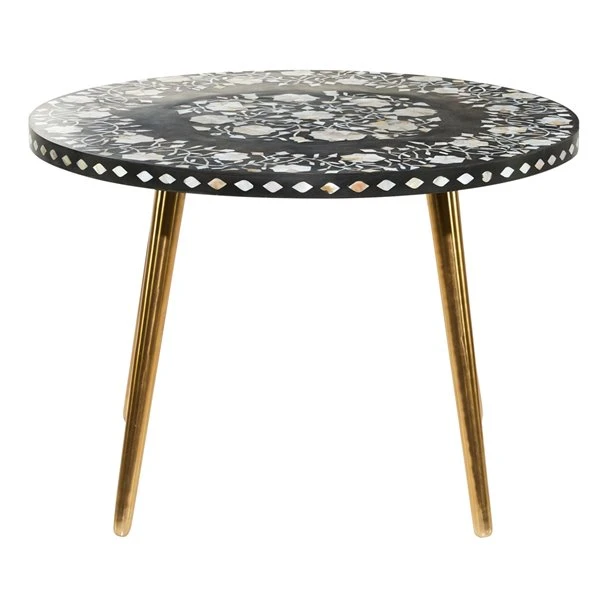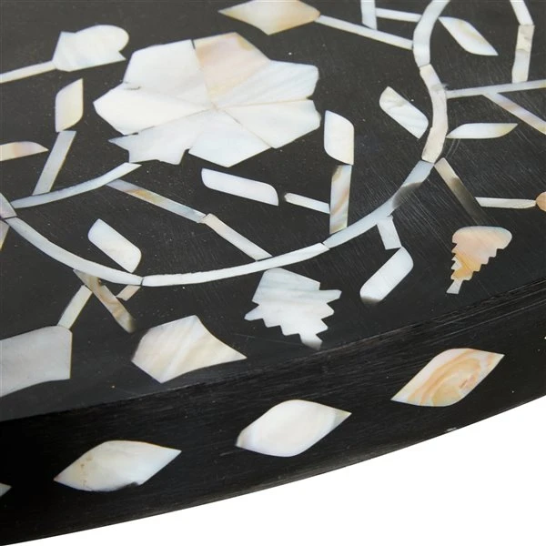 - Features shell inlays in round floral patterns on the smooth black wooden tabletop, and supported by 4 splayed tapered legs in a metallic gold finish