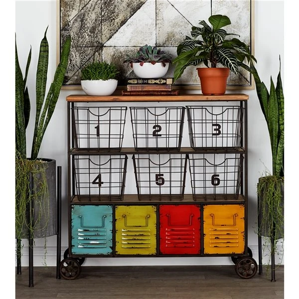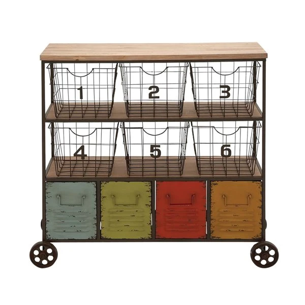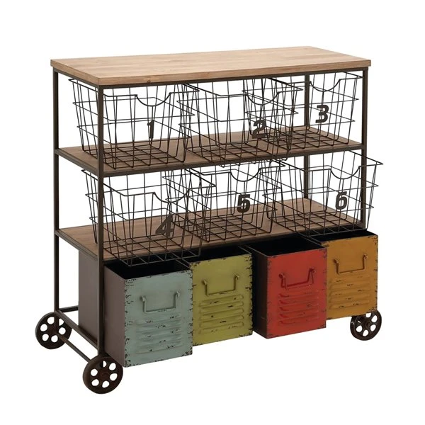 - Features natural brown wood shelves, iron grid baskets, and louvred drawers painted in different colours, with a distressed finish
