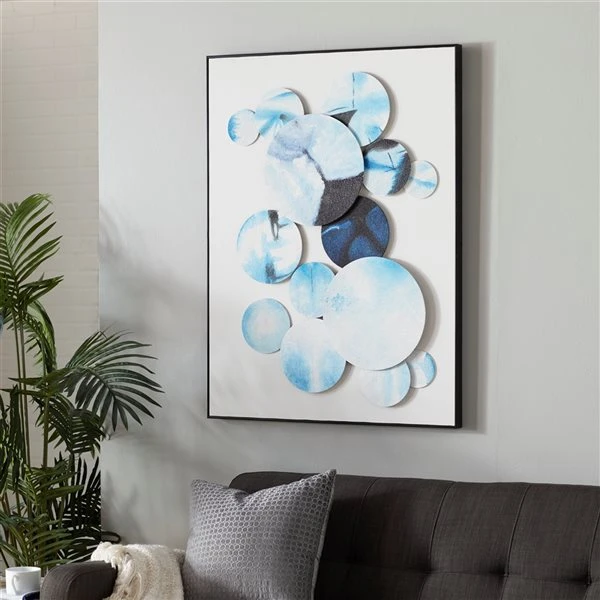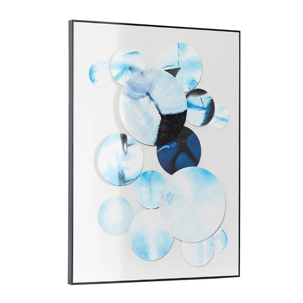 - Thin black wood frame housing a white canvas that holds round bright blue and white designs with bubbling water patterns