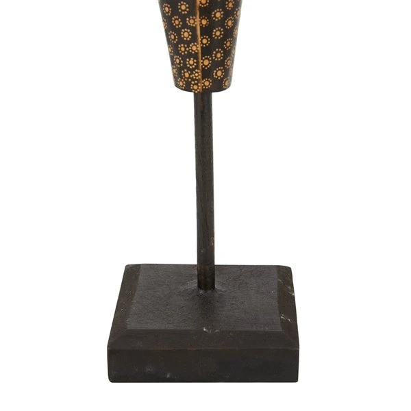 - These wooden people figures showcase a polished and textured black wooden finish with gold paint accents