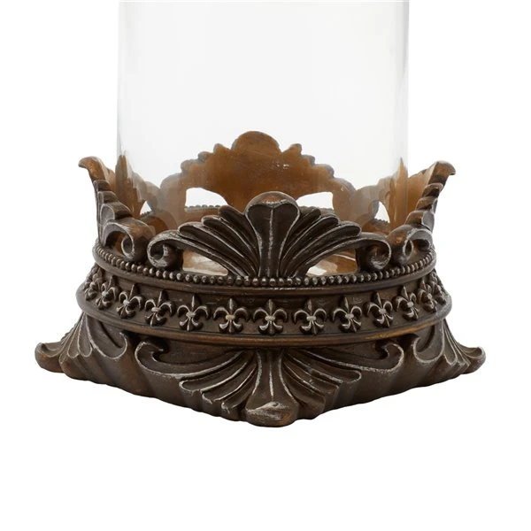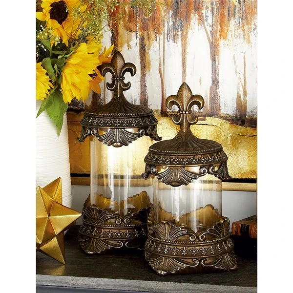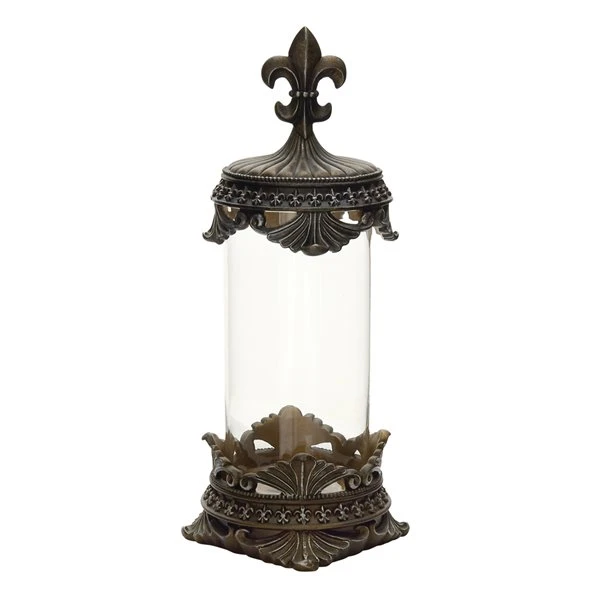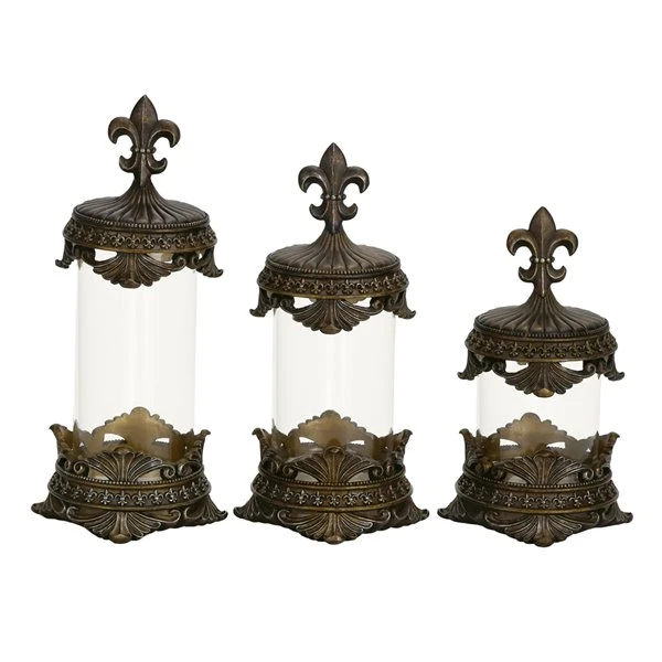 Brass-coloured acanthus and bold fleur de lis sculptures with antique finishes serve as lid handles, opening into 3 various-sized glass canisters. The glass displays well small decorative orbs, flower petals or simply display these on their own.