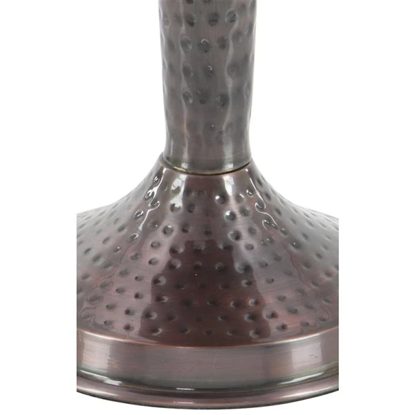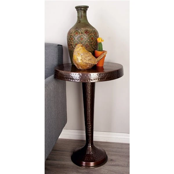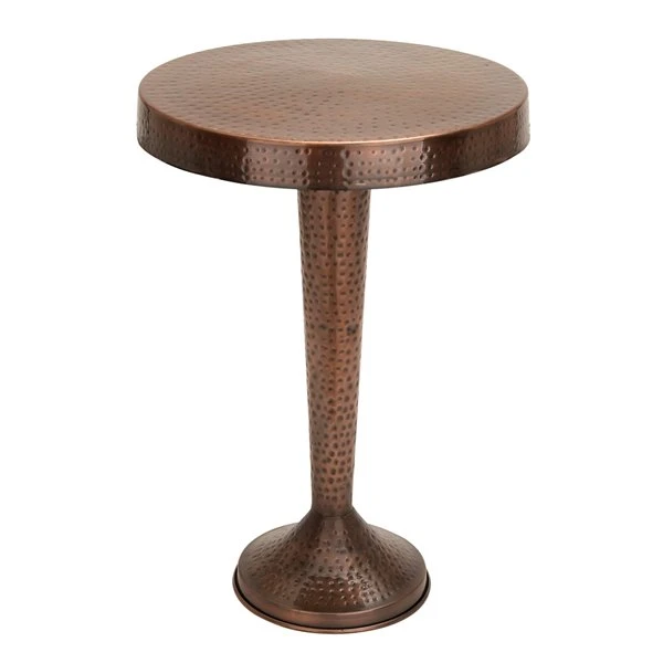 - The round metal accent table has an attractive hammered copper finish