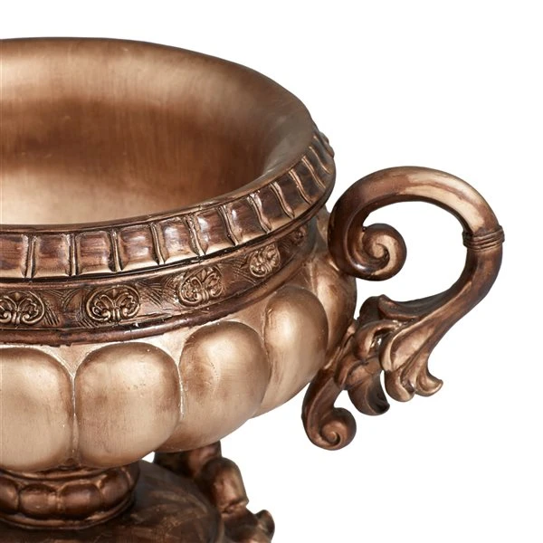 - A medley of ornate scrollwork and fleur-de-lis patterns with low relief accent details embellish this decorative vase