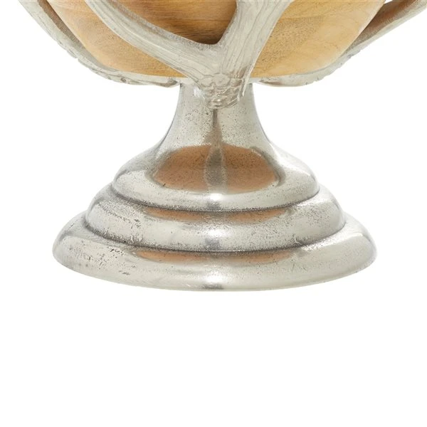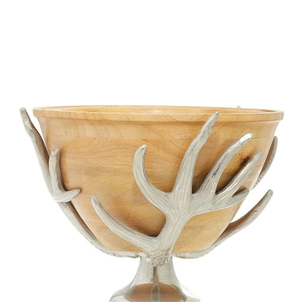 - Natural brown wood bowl finish and metallic silver antler stand finish