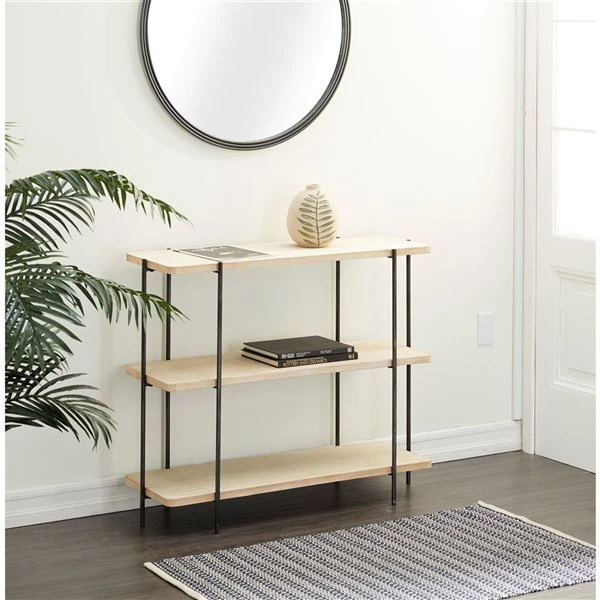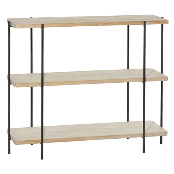 - Shelves are light beige with a black metal frame