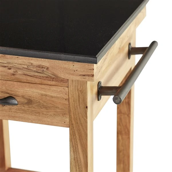 - A bare brown wood finish is featured on most of its exterior, except on the polished black tabletop and cart and drawer handles