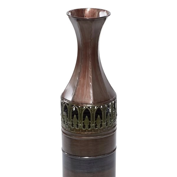 - This set of iron vases has a polished brown and an ombre-style blue-green finish