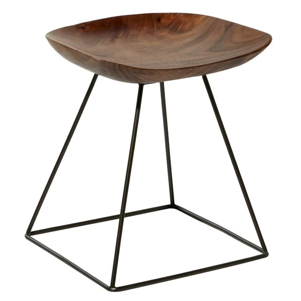 - The seat is made from Acacia wood mounted to a solid, geometric-shaped, black iron base