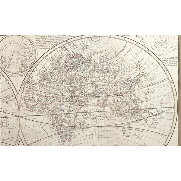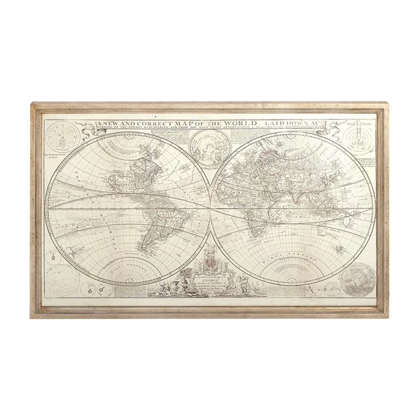 - Features a natural brown wooden frame and a parchment white world art drawing made with black ink