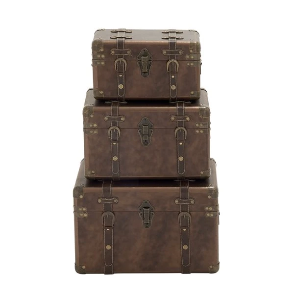 - This set of 3 trunks brings simplicity and elegance to your space with its brown finish