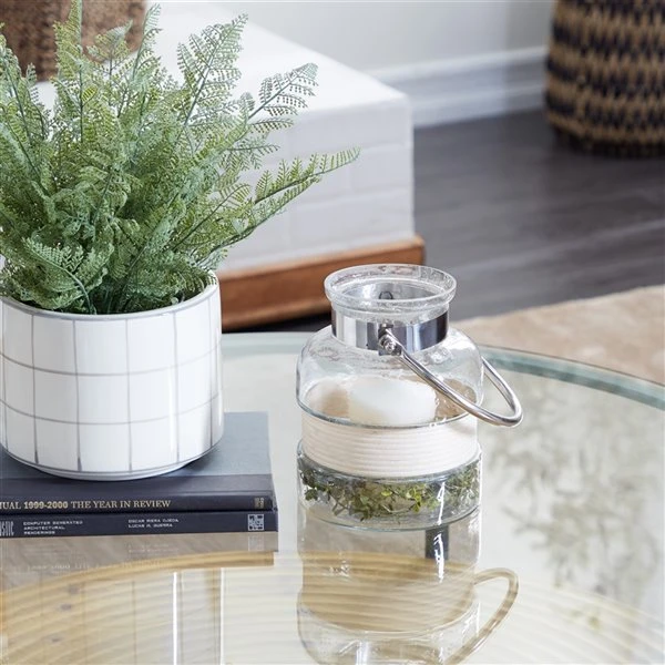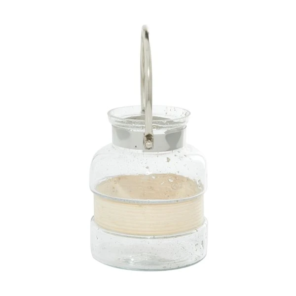 - Lantern-inspired clear blown glass with a metal handle