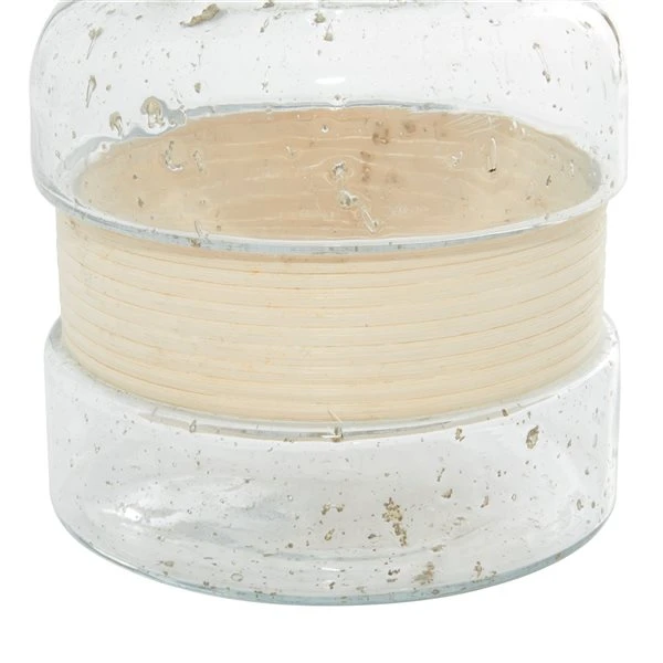 - Silver metal and beige ribbon strips decorate the clear glass lantern