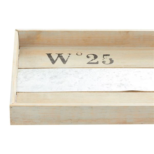- Natural beige wood hue with wood grain, long metallic silver galvanized metal panel, built-in slots for handles, and stenciled script with nautical directions, markers, and compasses