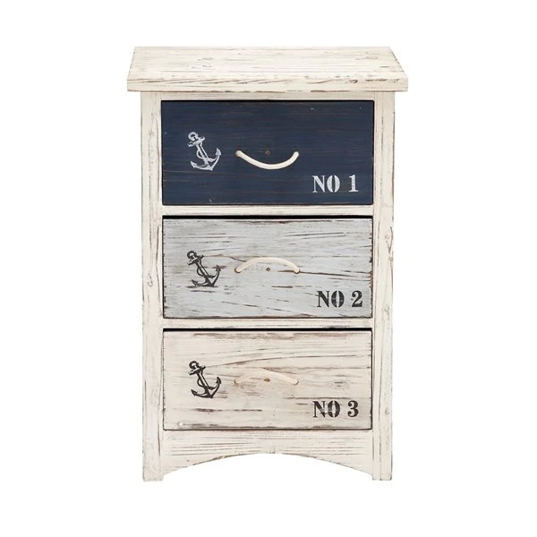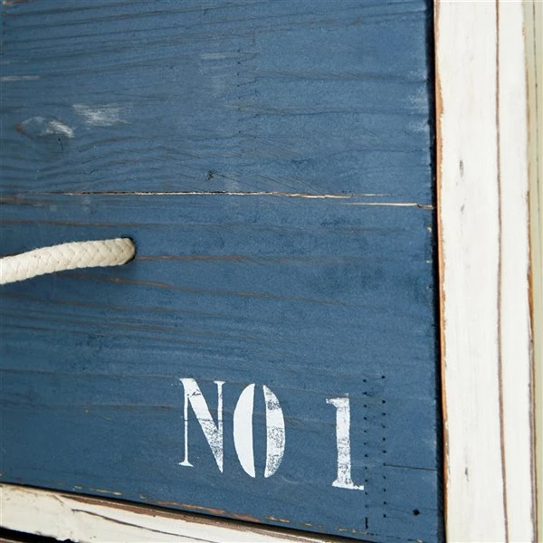 - Each drawer flaunts a printed anchor detail and rope for handles